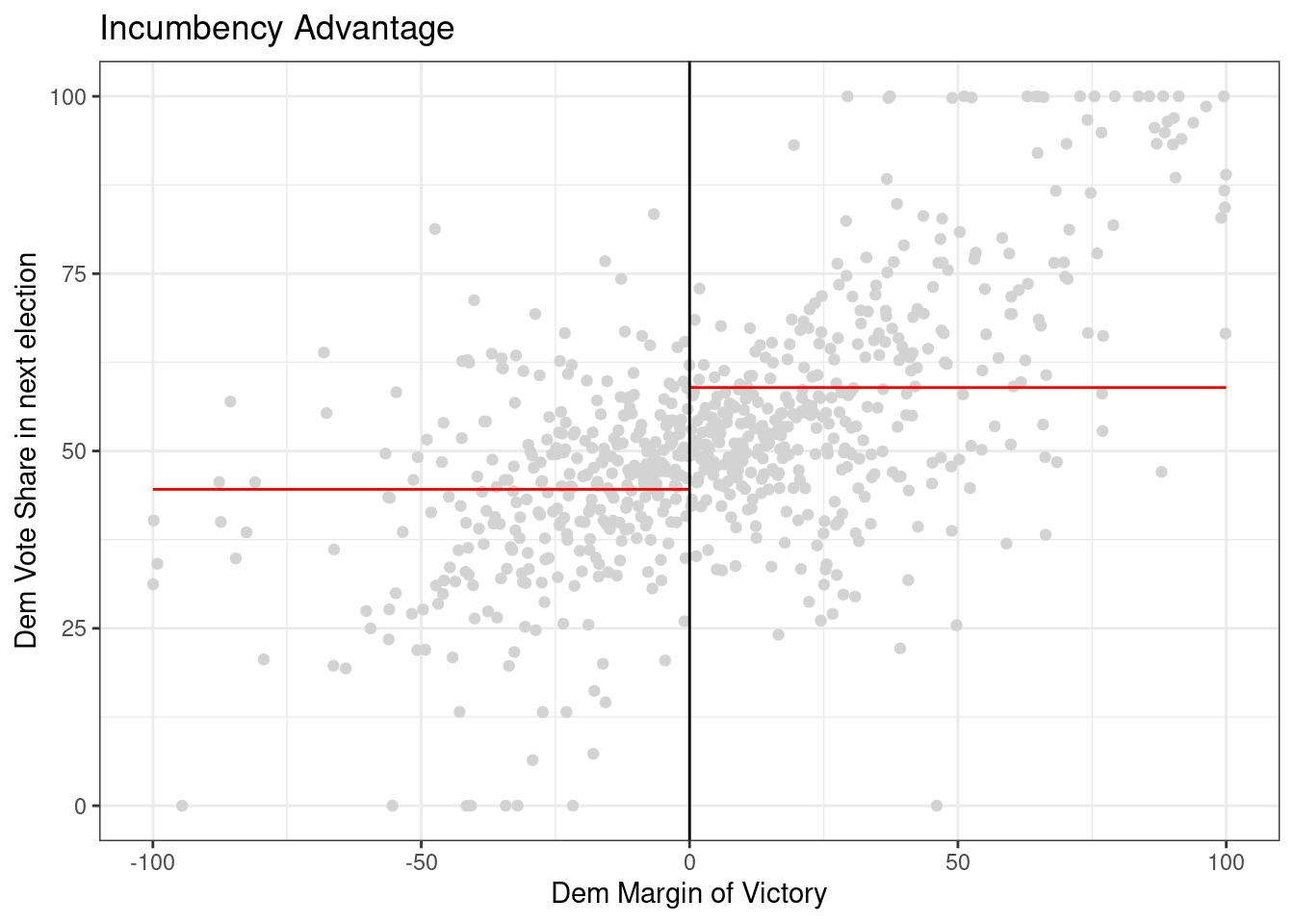 Political scientists are interested in the effect of being an incumbent (the currently elected politician) on the share of votes in an election. Being the current public official means increased name recognition, fundraising opportunities, etc. On the other hand, being an incumbent means you can get blamed for all the bad things that have happened during your term. Elections also give a natural setting where you have a cutoff: if you only win 49.9% of the votes, you’re out of luck… but win 50.1% of the votes and you’ve won the whole election!