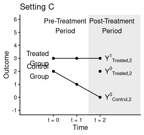 In the figures below, the treated group becomes treated between time 1 and time 2. The control group never becomes treated. Figures are hypothetical scenarios that depict true potential outcomes even if those outcomes would not be observed in an actual study.